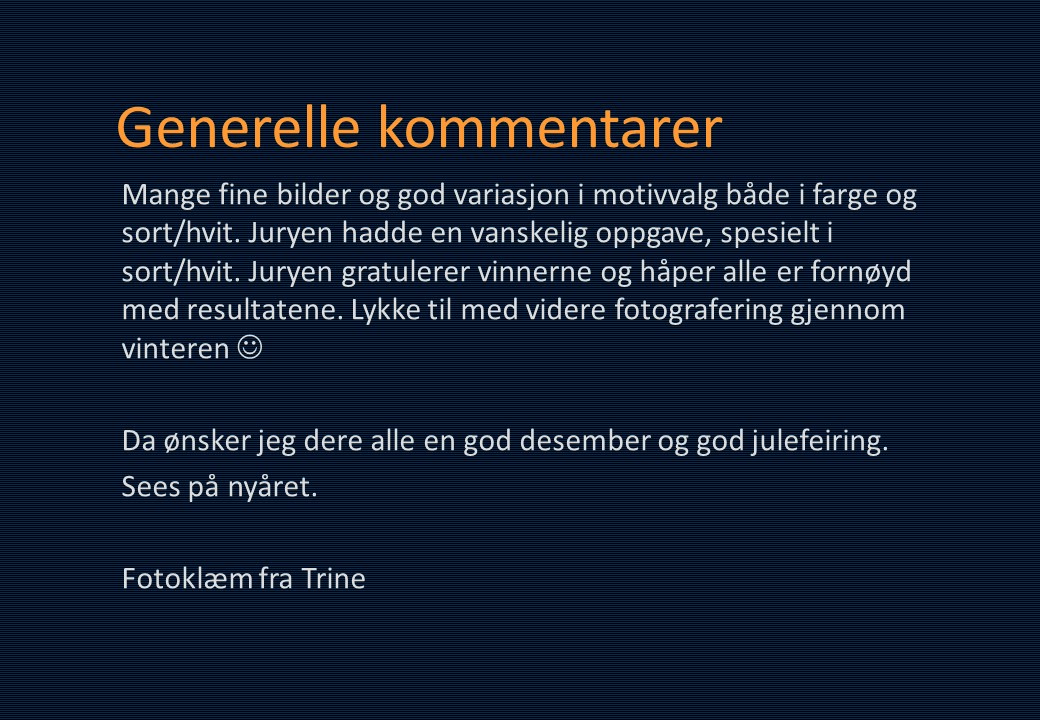 Mange fine bilder og god variasjon i motivvalg både i farge og sort/hvit. Juryen hadde en vanskelig oppgave, spesielt i sort/hvit. Juryen gratulerer vinnerne og håper alle er fornøyd med resultatene. Lykke til med videre fotografering gjennom vinteren!