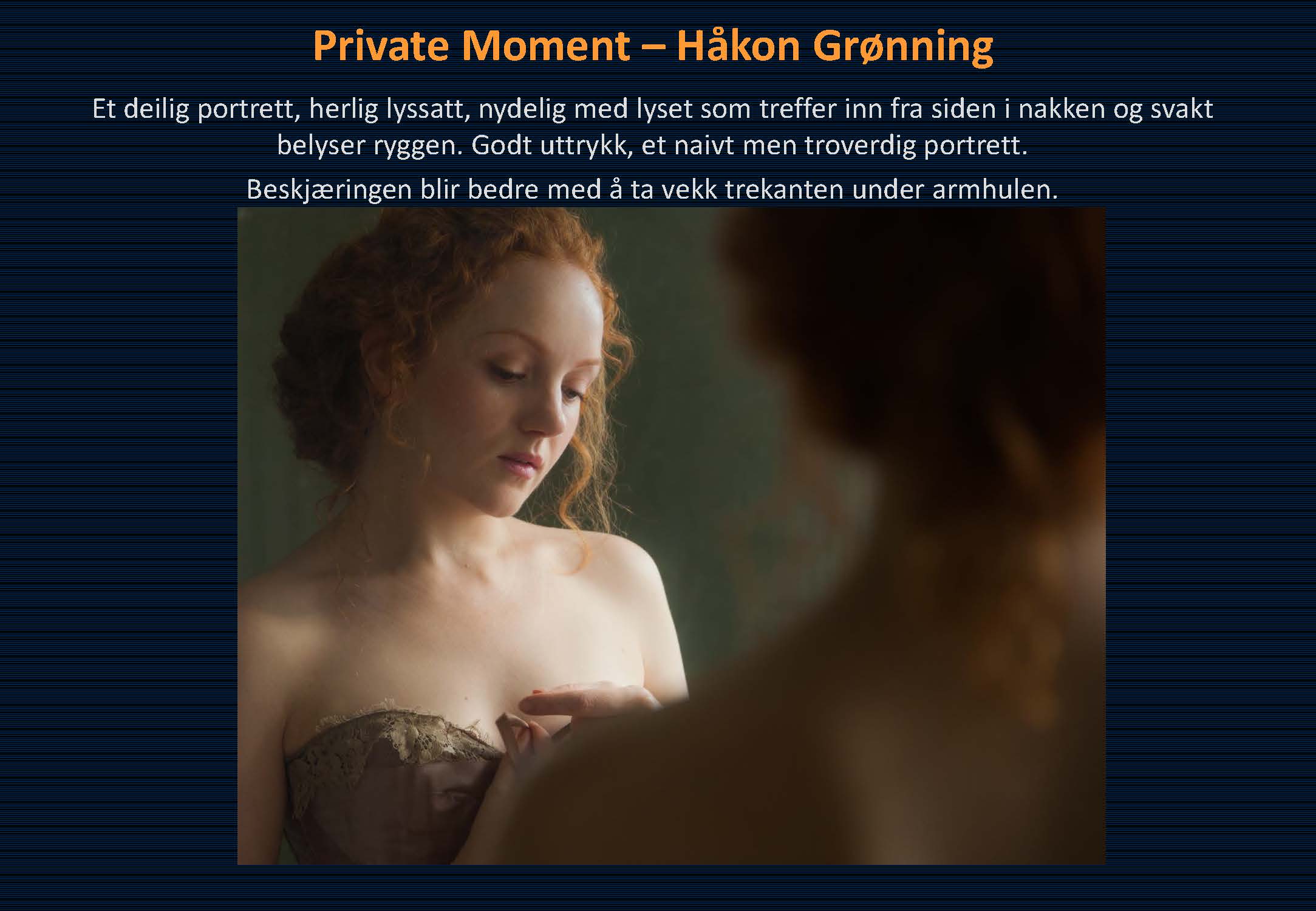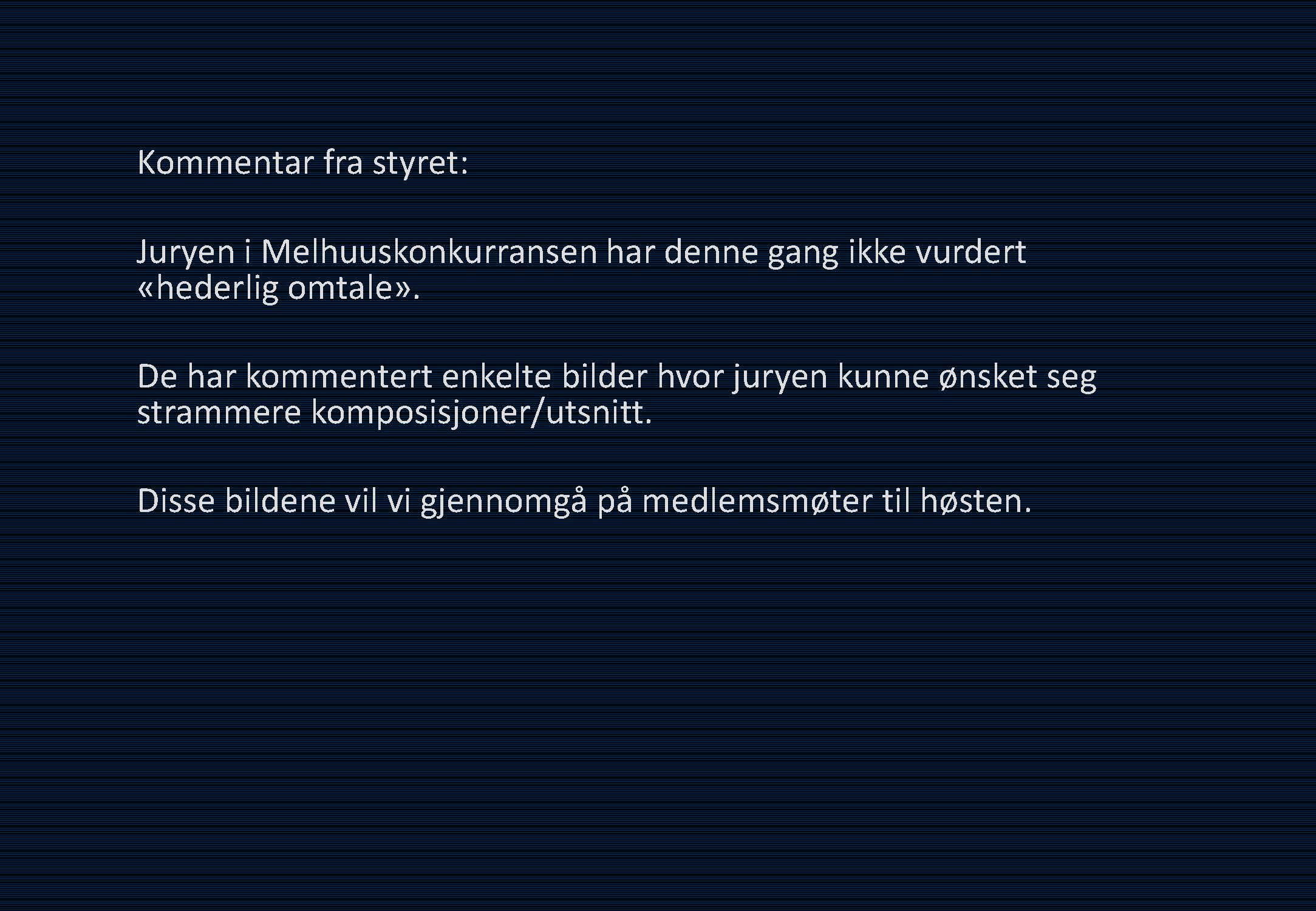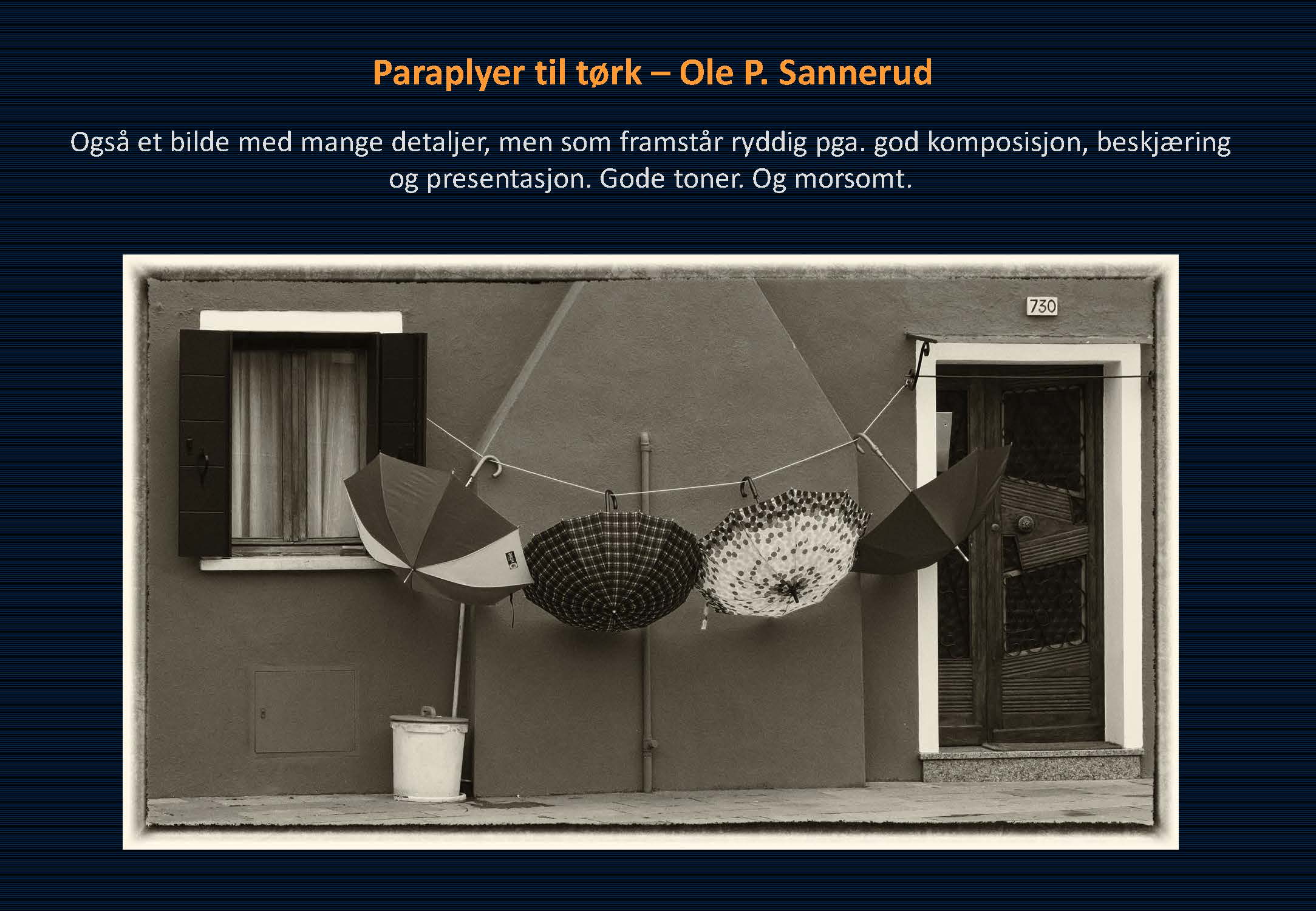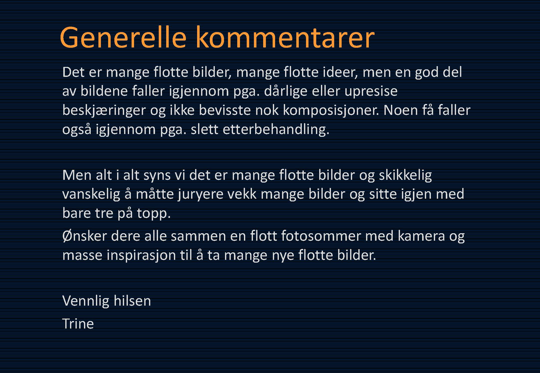 Det er mange flotte bilder, mange flotte ideer, men en god del av bildene faller igjennom pga. dårlige eller upresise beskjæringer og ikke bevisste nok komposisjoner. Noen få faller også igjennom pga. slett etterbehandling.