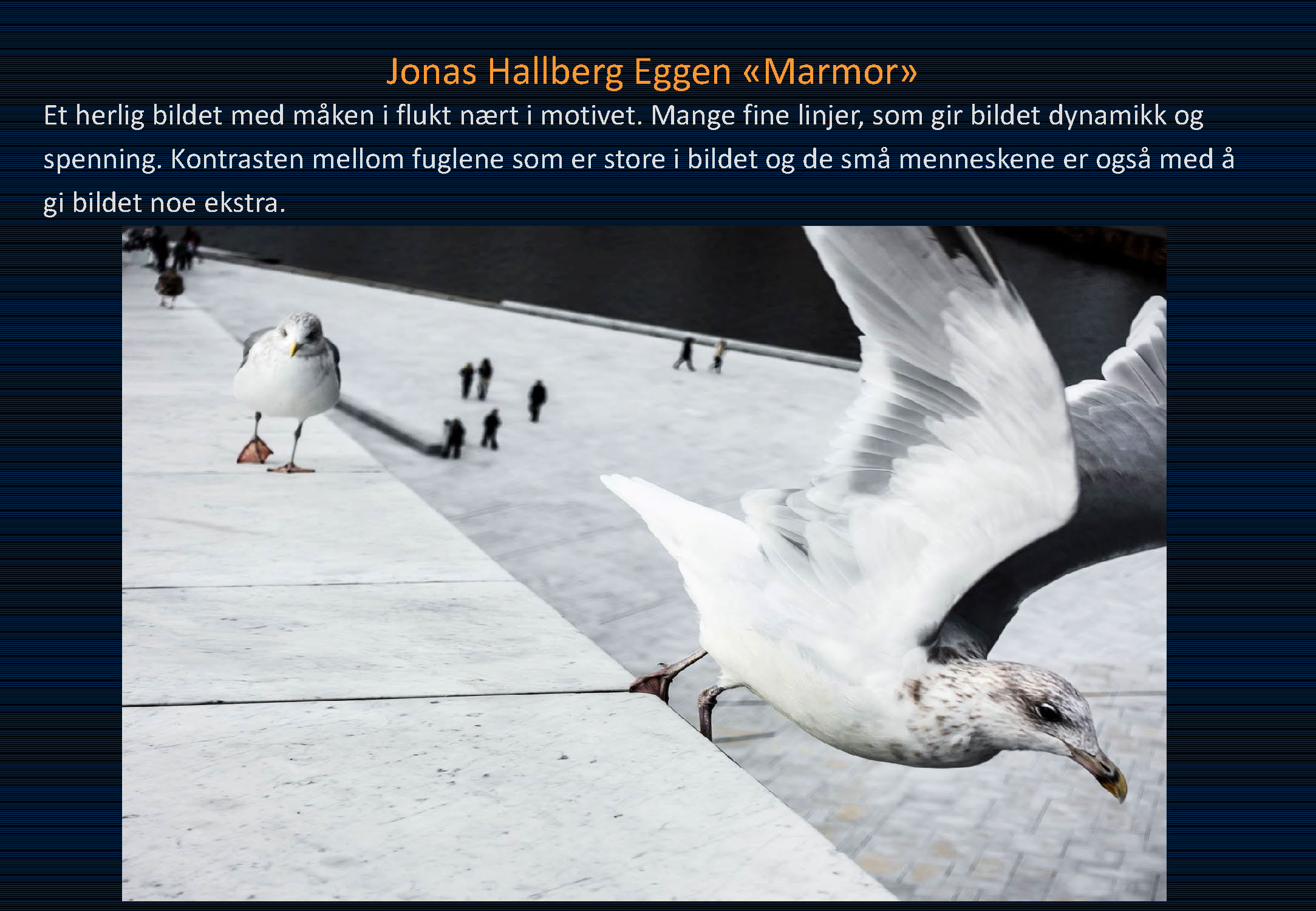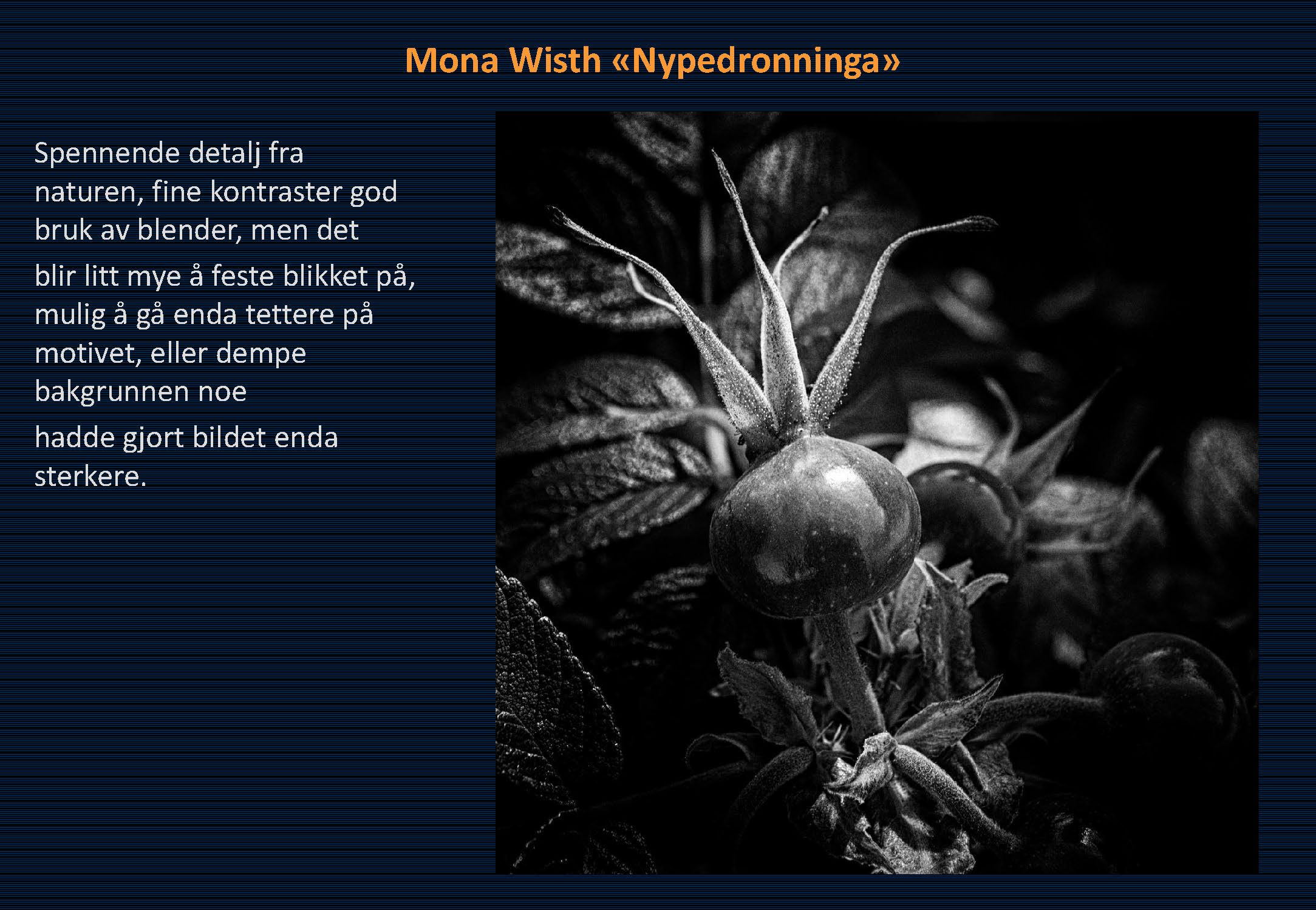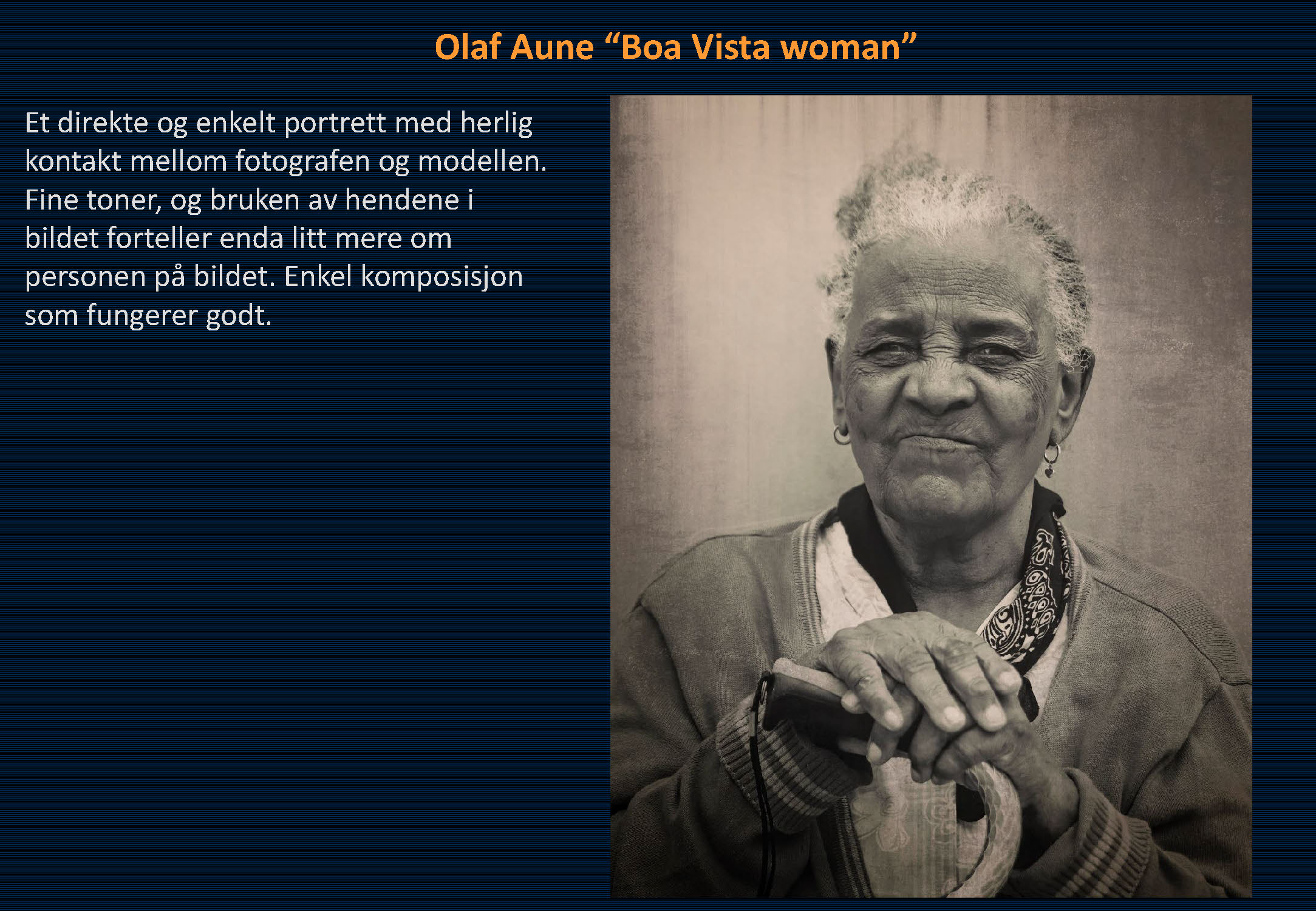 74 bilder ble levert i klassen «Monokrom – Fritt motiv». Vinner ble Olaf Aune med «Boa Vista woman». 2. plass gikk til Jonas Hallberg Eggen med «Underlag» og Linh Hoang tok 3. plass med bildet «Soul in motion».