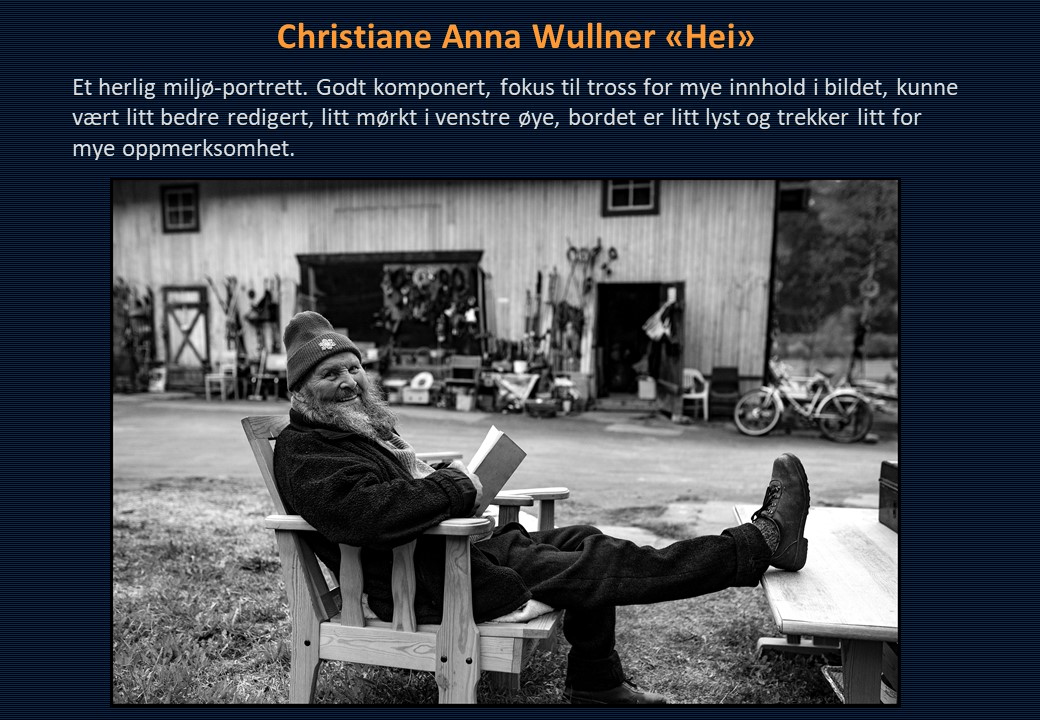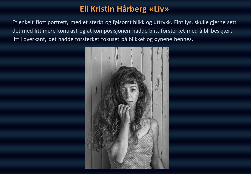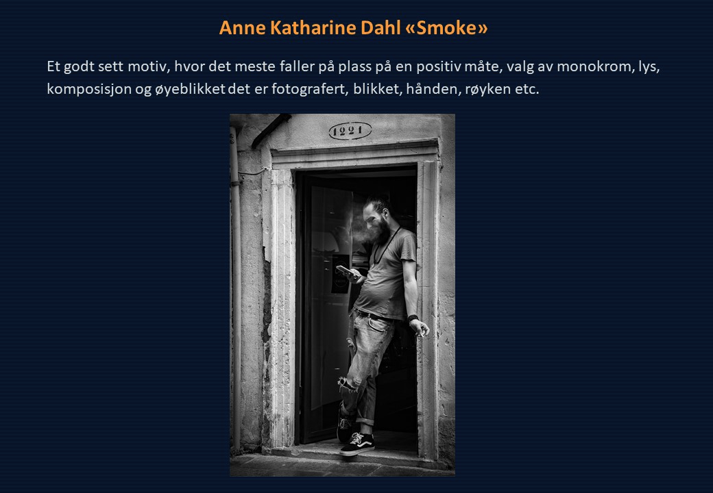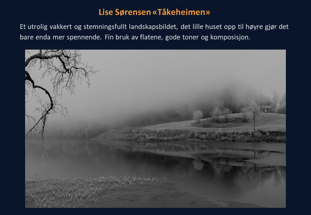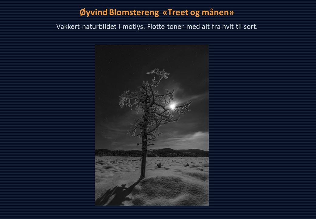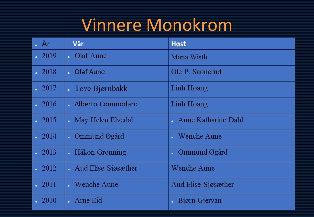 Vinner i klassen «Monokrom – Fritt motiv» ble Mona Wisth med bildet «Elvebredd». 2. plassen gikk til Anne Katharine Dahl med «Smoke». Christiane Anna Wüllner sitt bilde «Hei» og Eli Kristin Hårberg sitt bilde «Liv» kom på delt 3. plass.