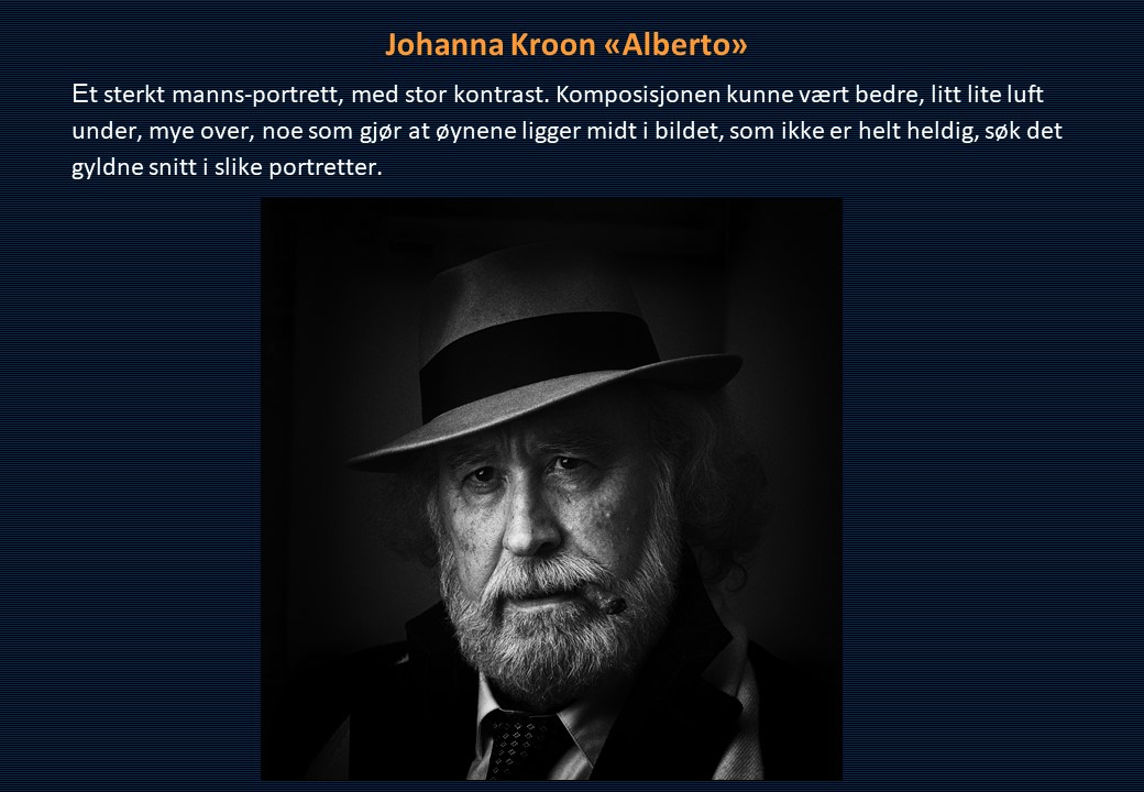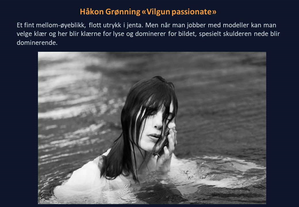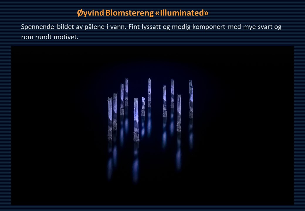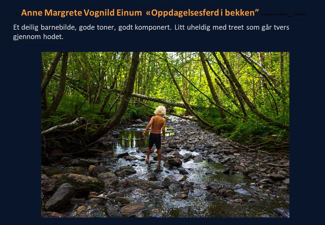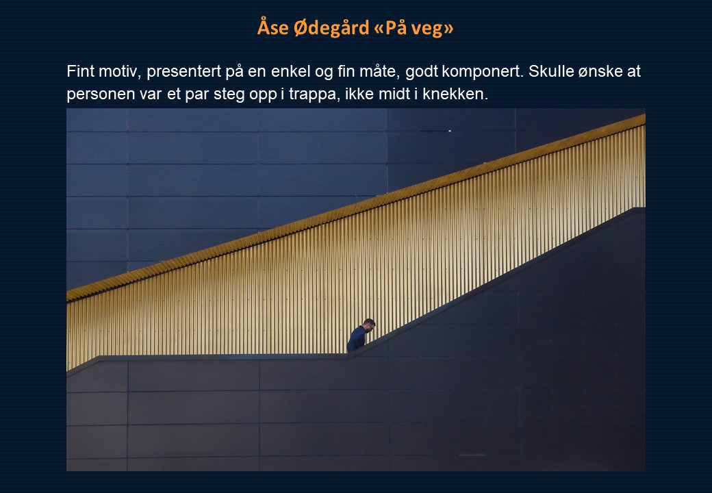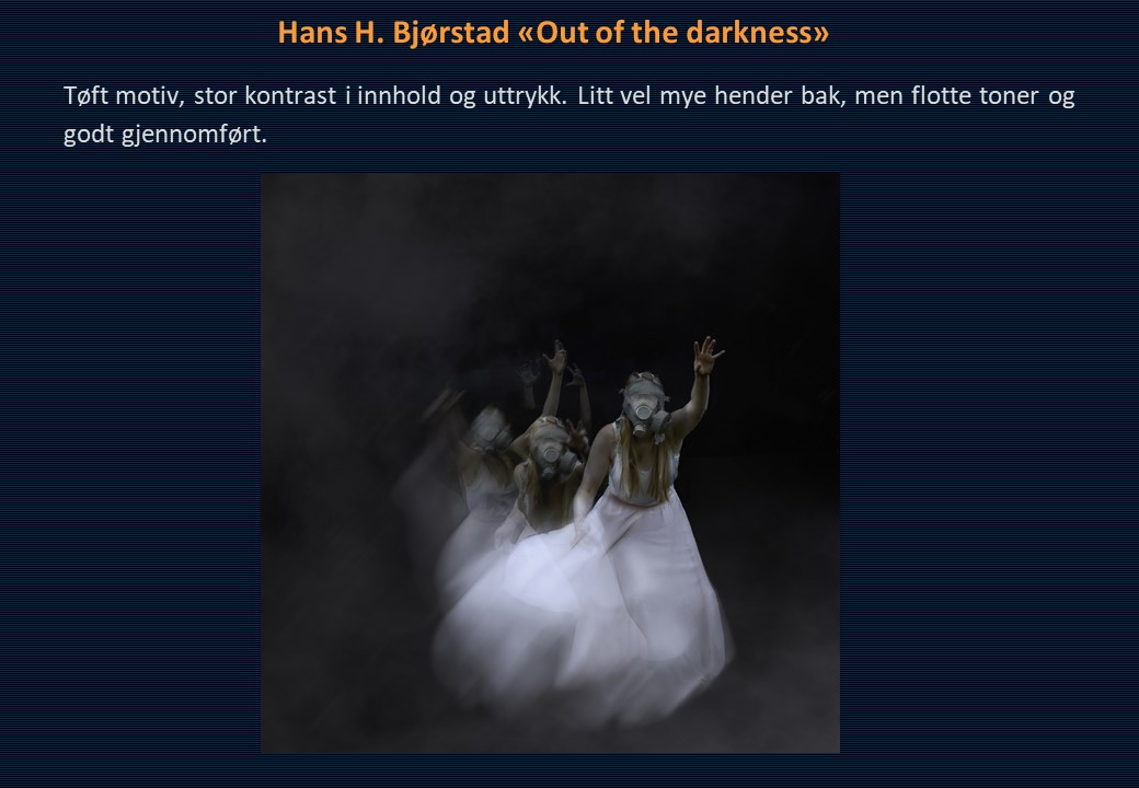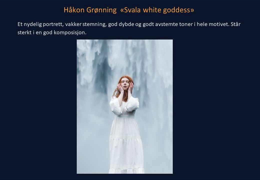 Vinner i klassen «Monokrom – Fritt motiv» ble Mona Wisth med bildet «Elvebredd». 2. plassen gikk til Anne Katharine Dahl med «Smoke». Christiane Anna Wüllner sitt bilde «Hei» og Eli Kristin Hårberg sitt bilde «Liv» kom på delt 3. plass.