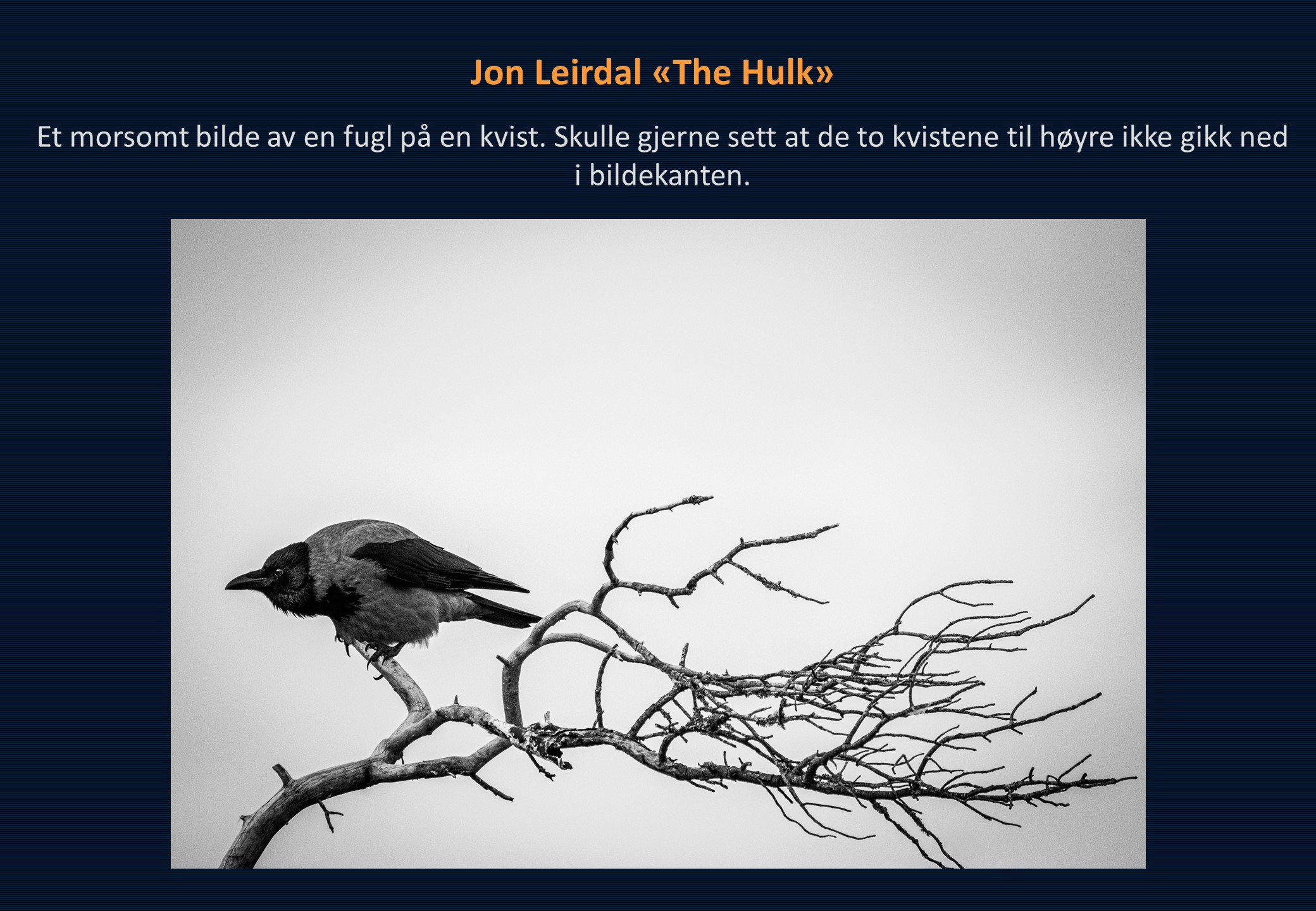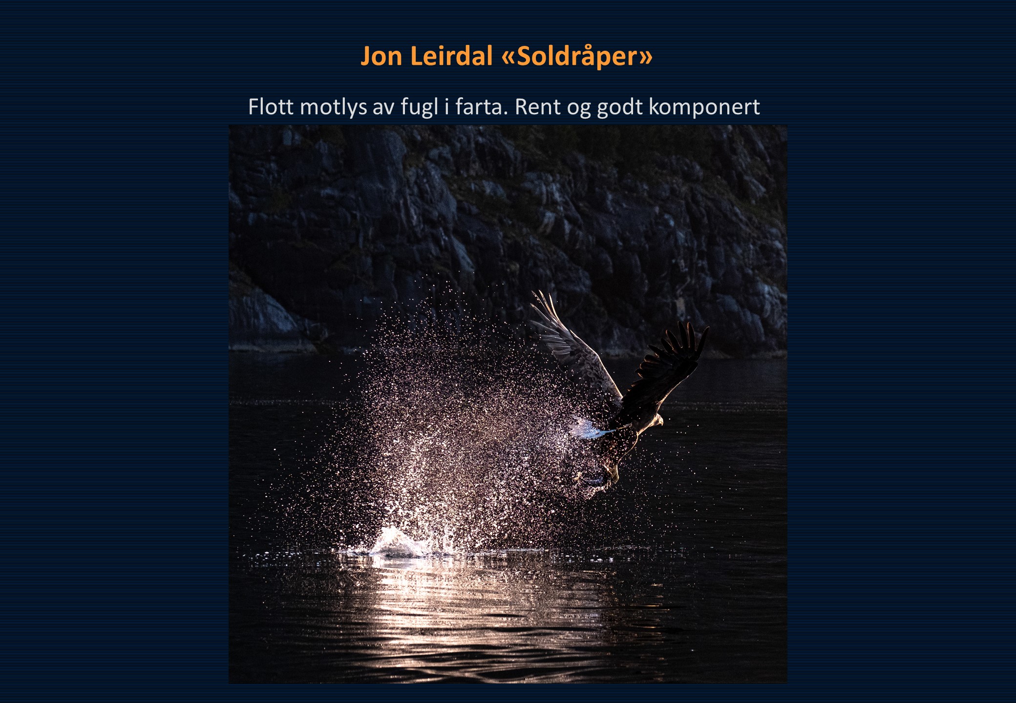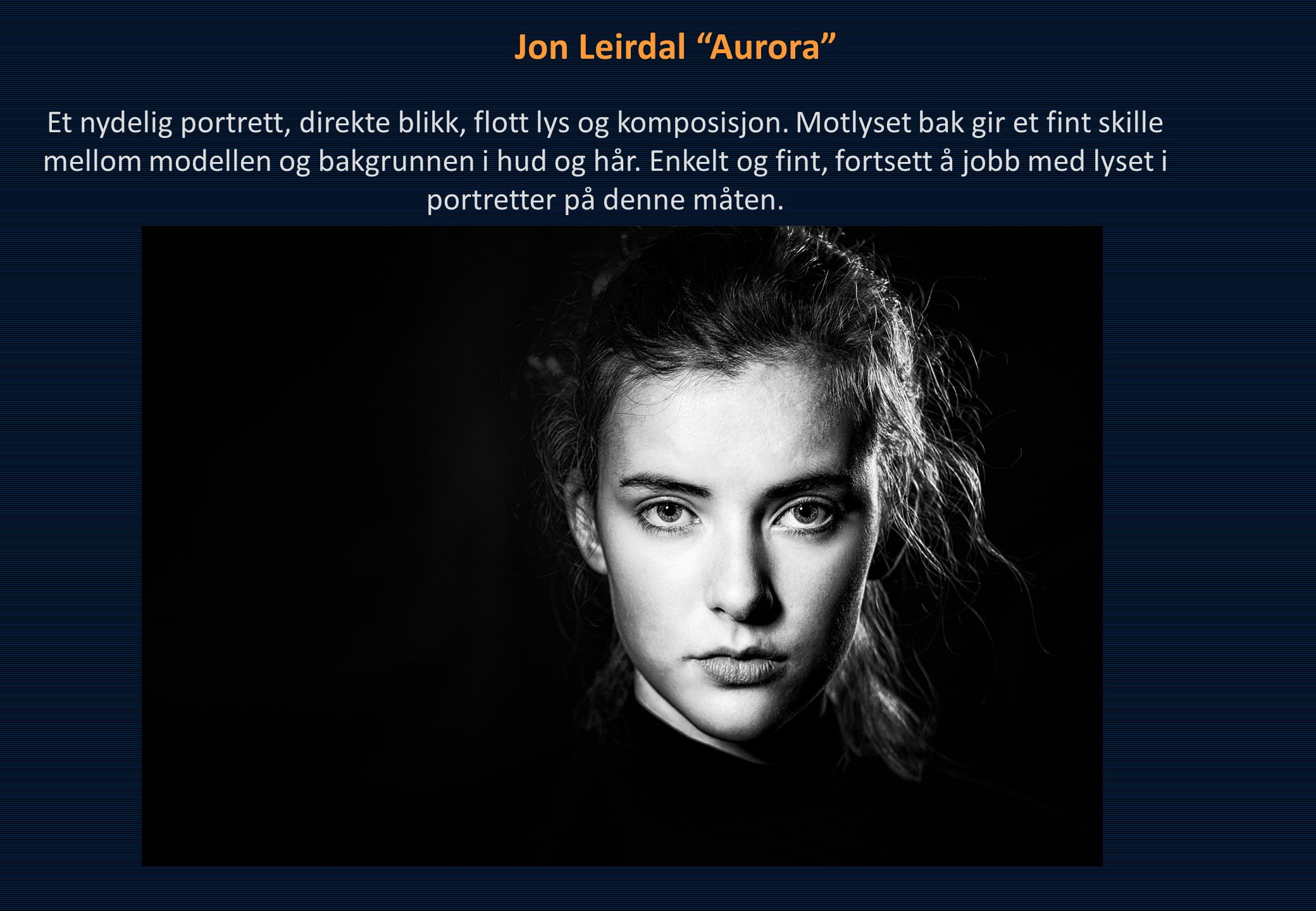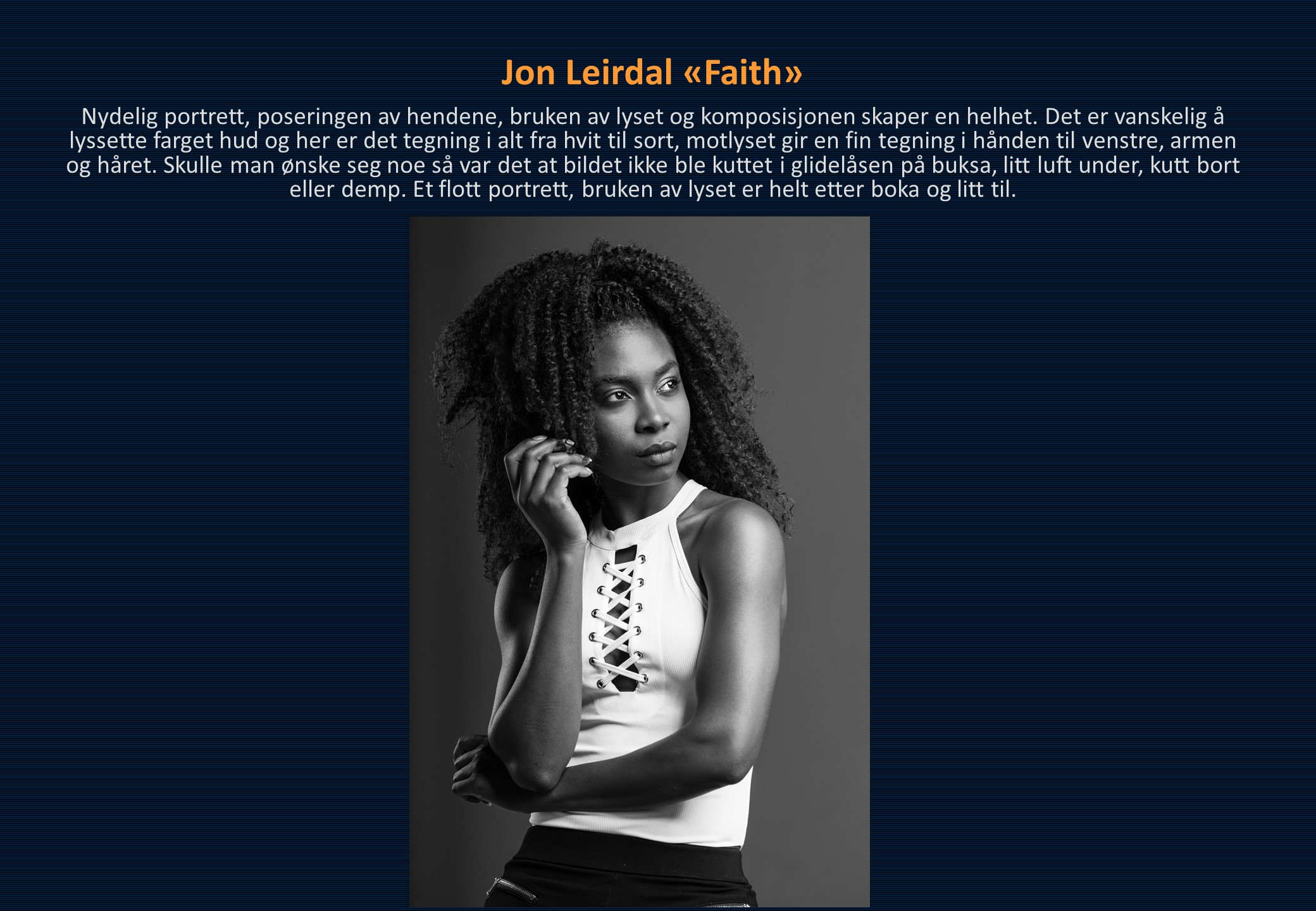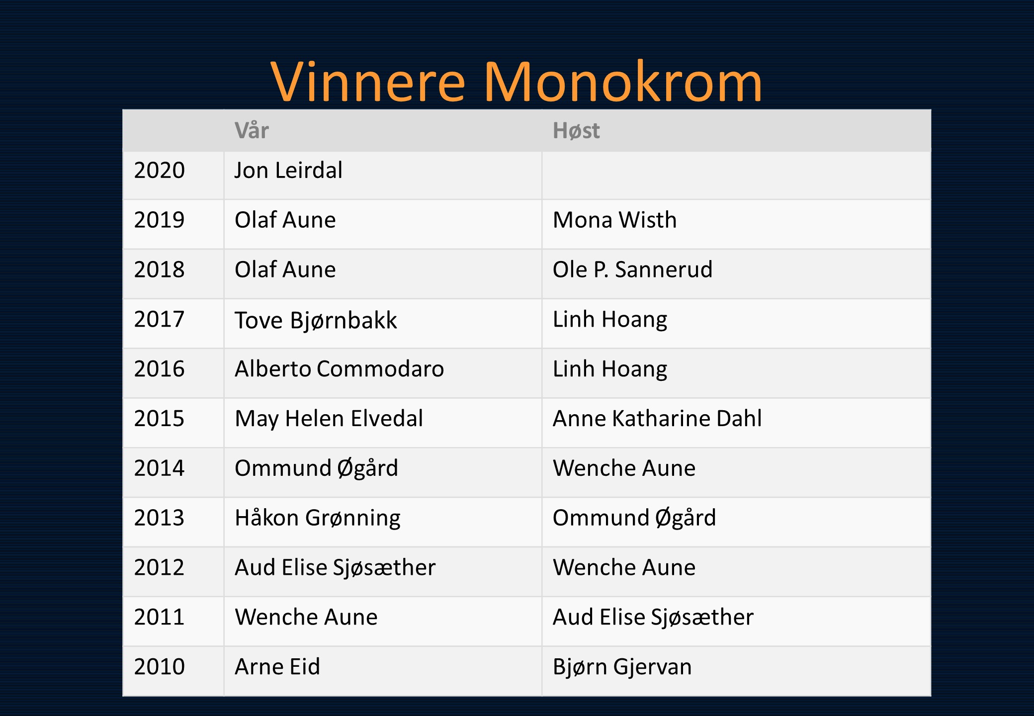 Vinner i klassen «Monokrom – Fritt motiv» ble Jon Leirdal med bildet «Aurora». Han fikk også 2. plass med bildet «Faith». Ommund Øgård sitt bilde «Madonna» kom på 3. plass.