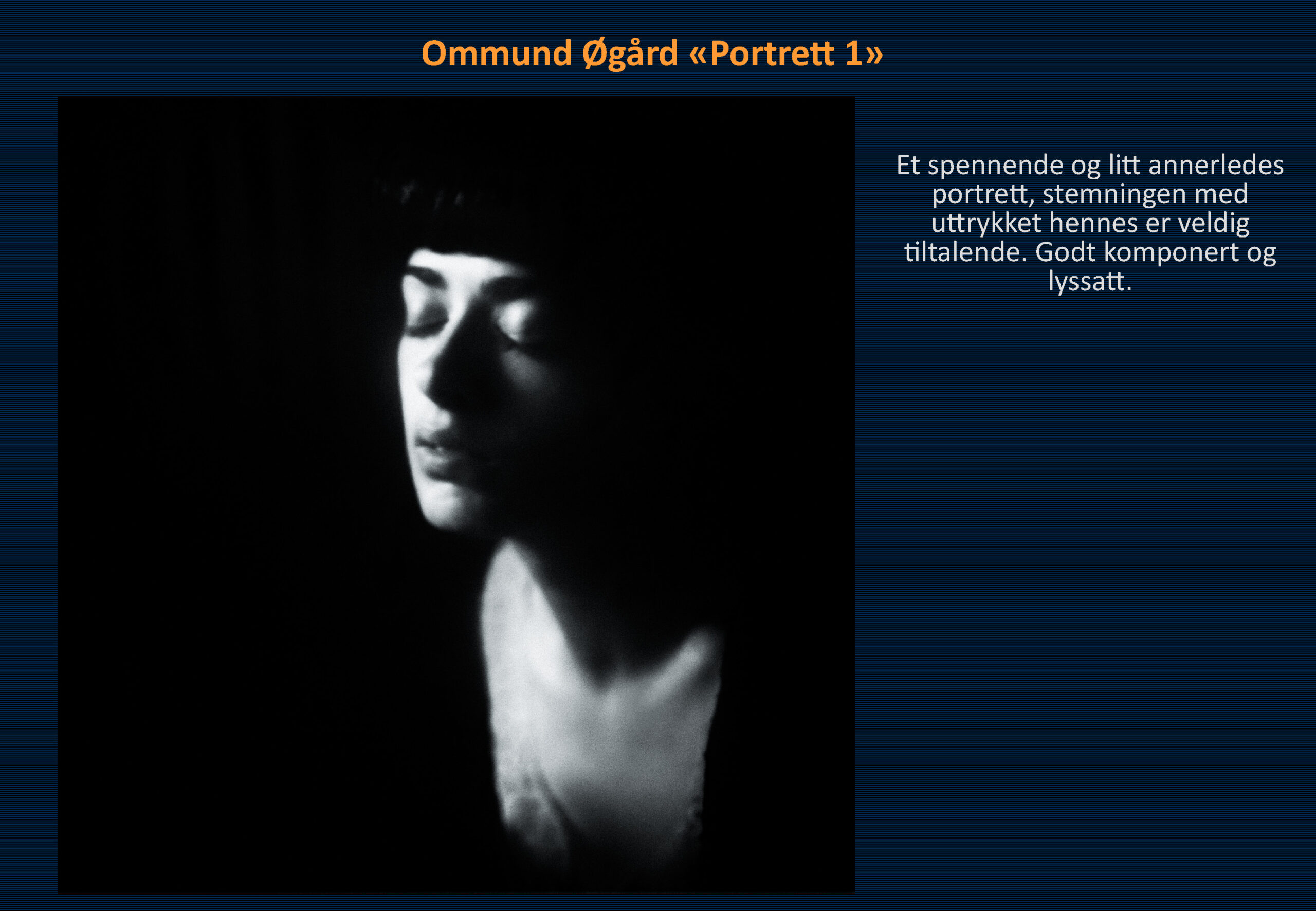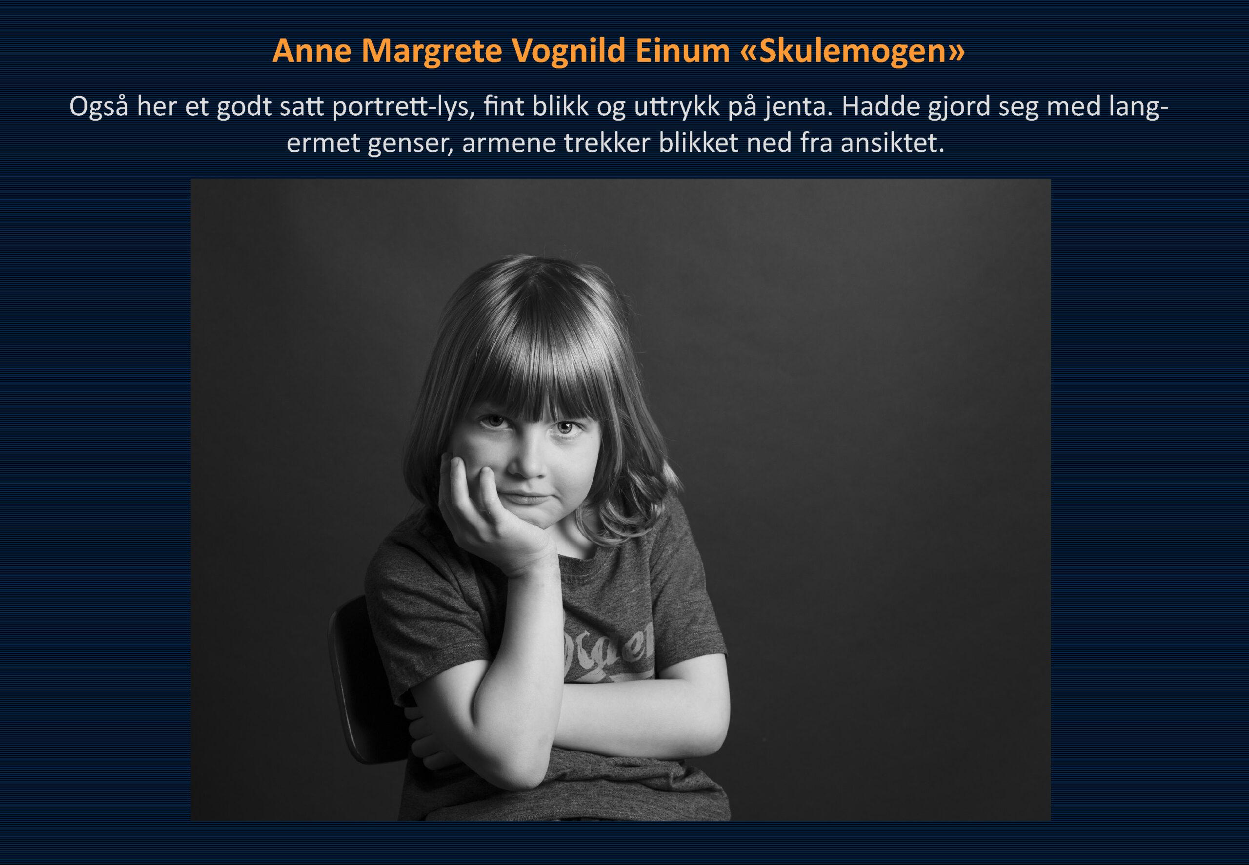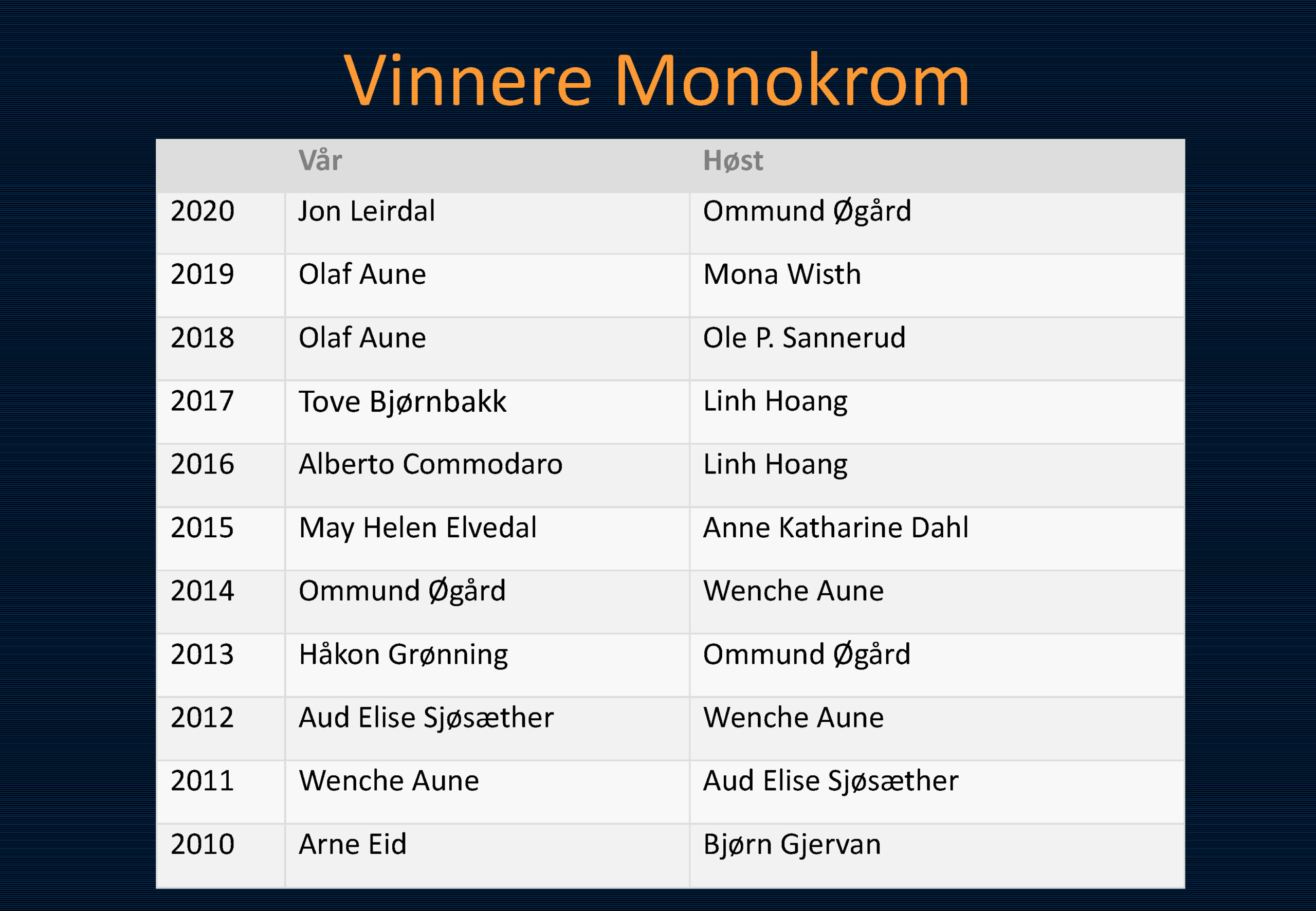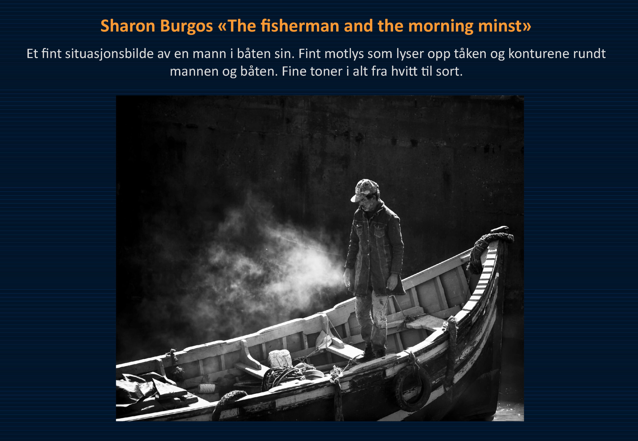 Vinner i klassen «Monokrom – Fritt motiv» ble Ommund Øgård med bildet «Portrett 1». Sharon Burgos kom på 2. plass med «The fisherman and the morning minst» og på 3. plass kom Håkon Grønning sitt bilde «Her skin is like velvet».